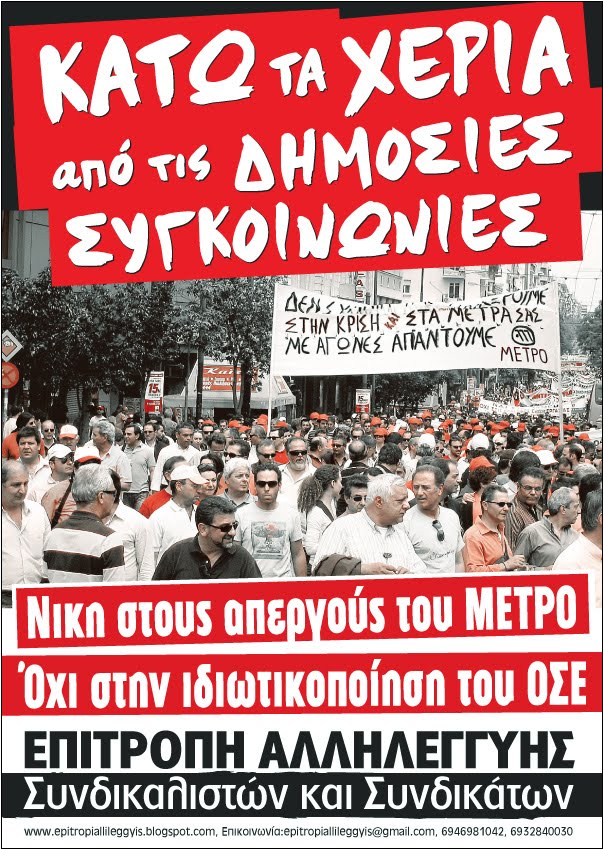 ΠΑΝΕΡΓΑΤΙΚΉ ΑΠΕΡΓΙΑ ΤΩΡΑ!Οι εργαζόμενοι στον ΟΣΕ δίνουν την μάχη για να σώσουμε τα τραίνα, για να μην κουτσουρευτεί το σιδηροδρομικό δίκτυο, για να μην προστεθούν χιλιάδες εργαζόμενοι στις ουρές των ανέργων που μακραίνουν, για να είναι η μετακίνηση δημόσιο αγαθό και όχι εμπόρευμα στα χέρια των αρπακτικών της αγοράς. Για αυτό όλοι εμείς που ξεσηκωθήκαμε στις Πανεργατικές Απεργίες για να μην περάσει το Μνημόνιο ΔΝΤ-ΕΕ και η σφαγή του ασφαλιστικού χρειάζεται να συνεχίσουμε και να τους στηρίξουμε.
